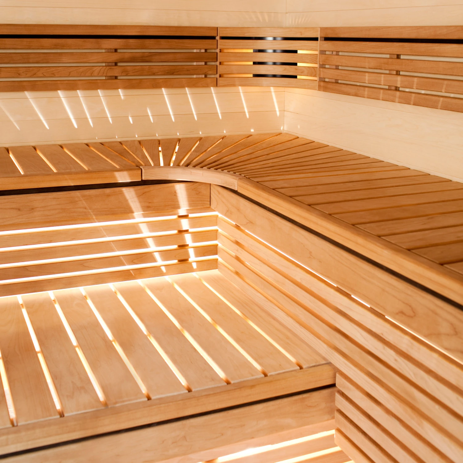 I badstuinnredningen Harvia Solar er materialene satt inn i tverretningen. Vi kan hjelpe deg med å designe din badstue og leverer benker og panel på mål.