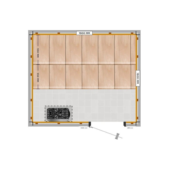 Prisen på denne badstuen er et eksempel på en badstue på 190 x 160 cm, interiøret lages til på dine mål og med utstyret du ønsker i badstuen!