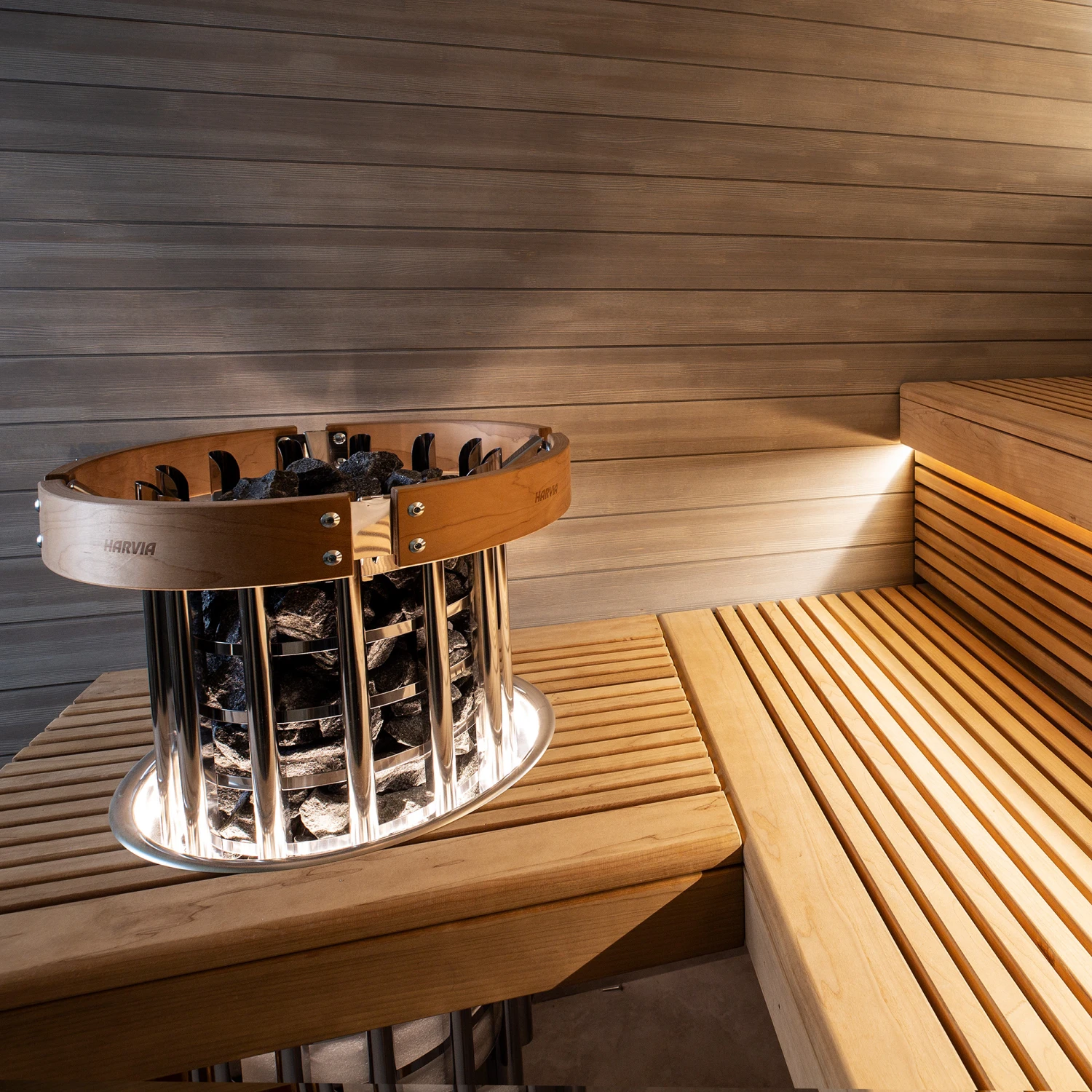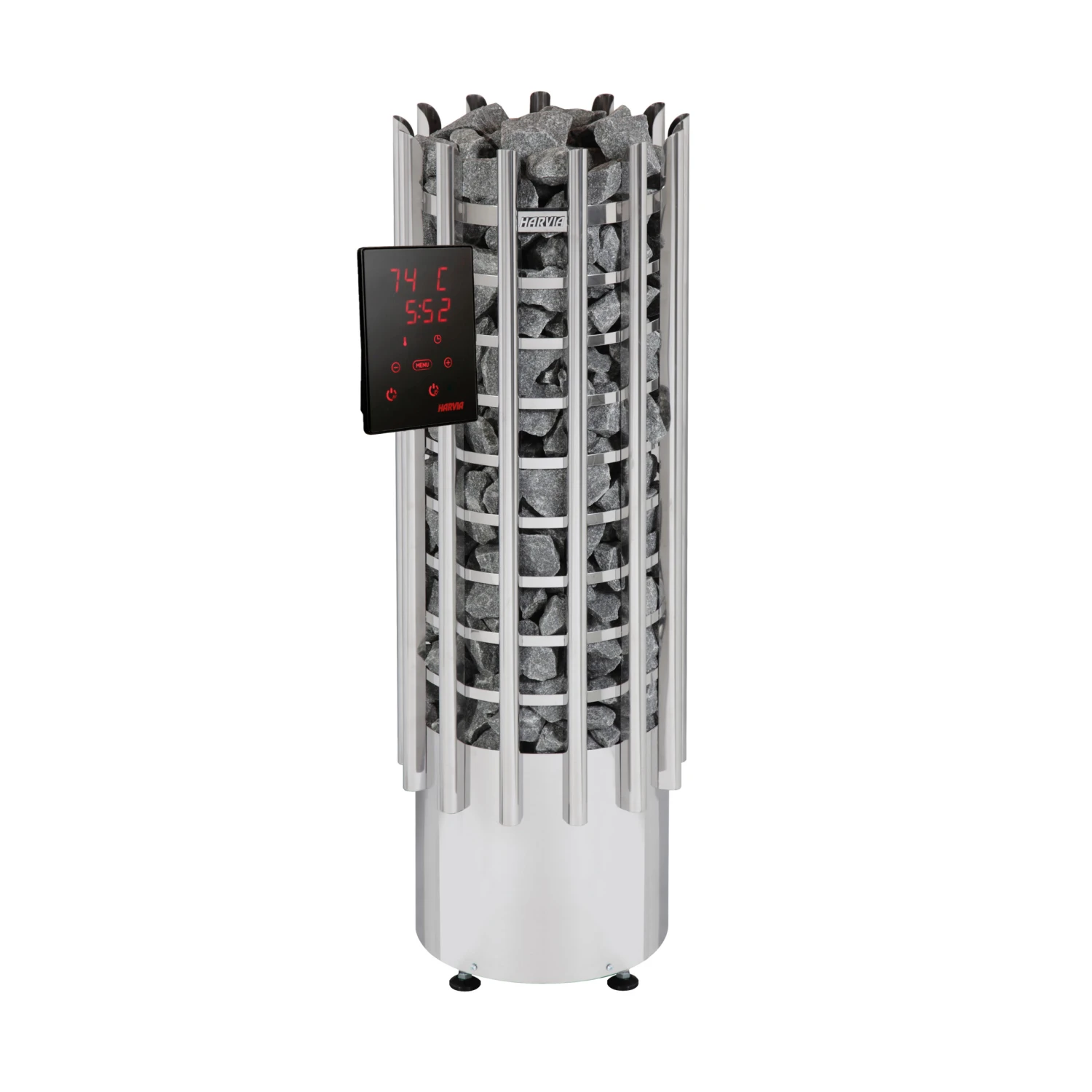 Harvia Glow søylevarmer på 7 kW er designet for å møte behovene til selv den mest krevende badstudekoratøren. Pakke med Glow badstuovn og Xenio kontrollpanel.