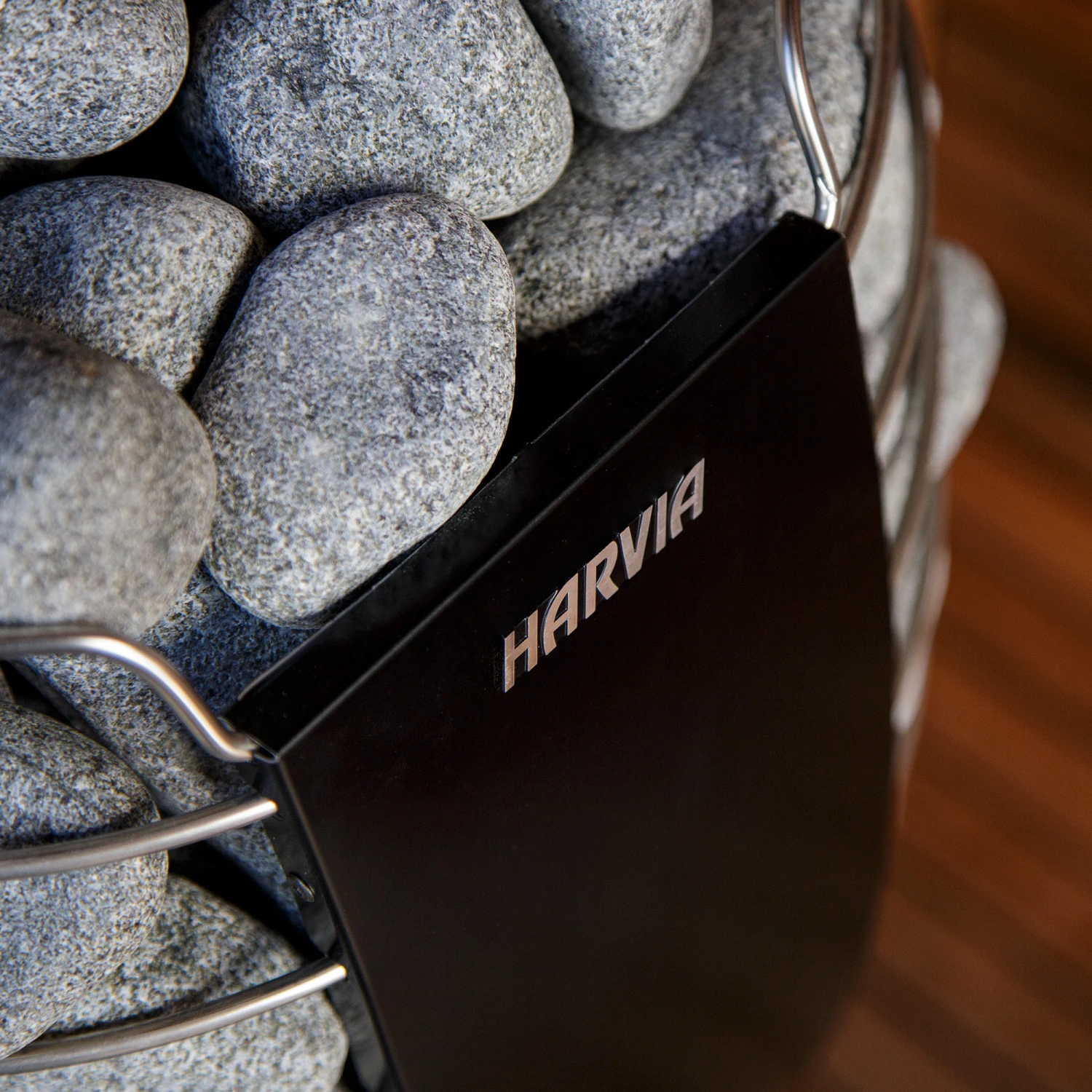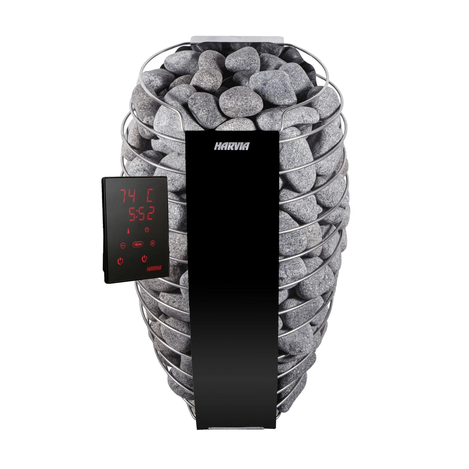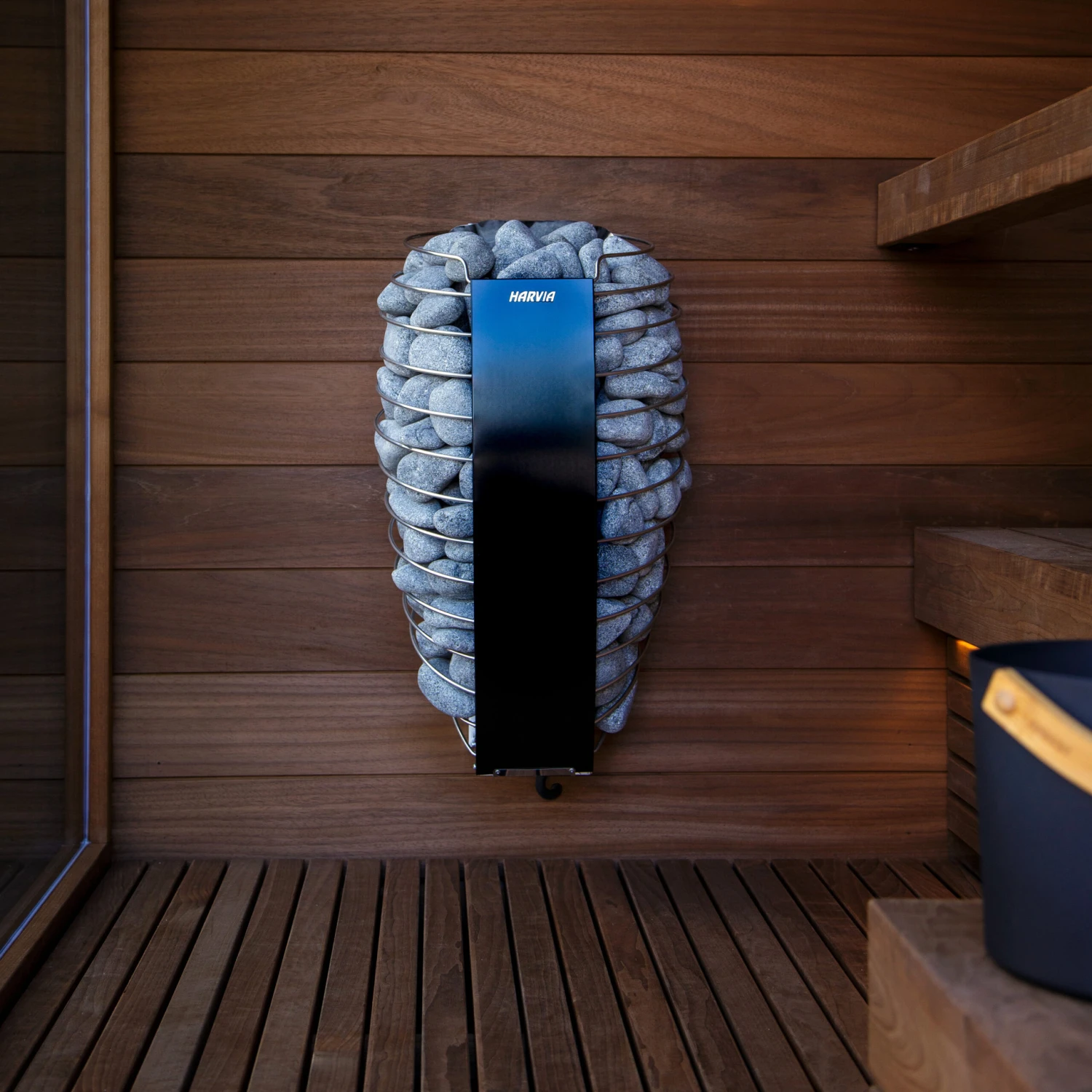 Elektrisk badstuovn med buede former og et design inspirert av naturen. Harvia Spirits design fremhever de runde steinene og skaper en moderne og elegant atmosfære med en mild damp.