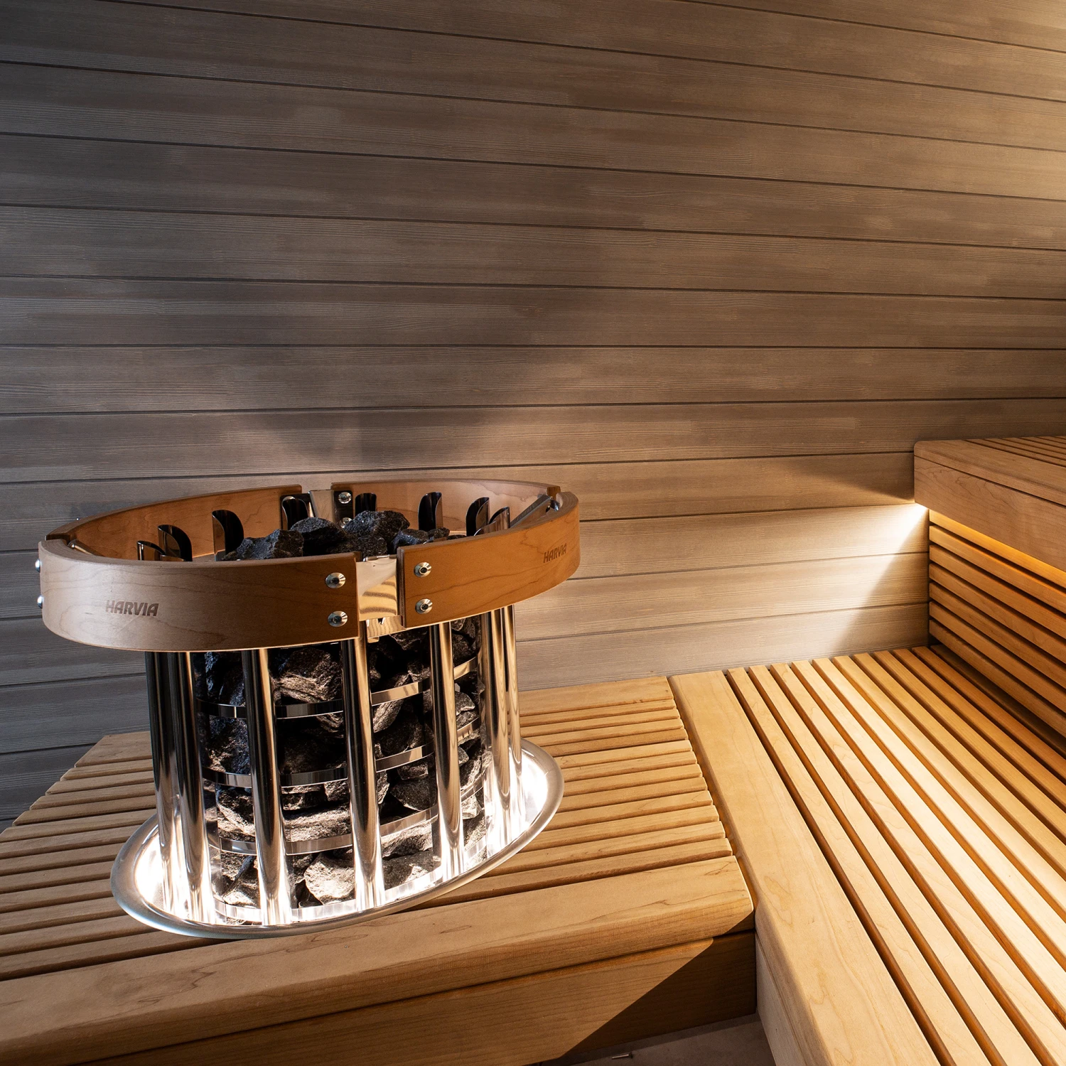 Beskyttelsesring til Harvia Glow badstuovn er en god måte å øke sikkerheten rundt Harvia Glow. Beskyttelsesringen er laget av varmebehandlet tre, og gir et stilig preg på badsturommet.