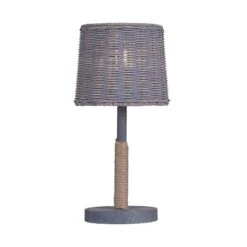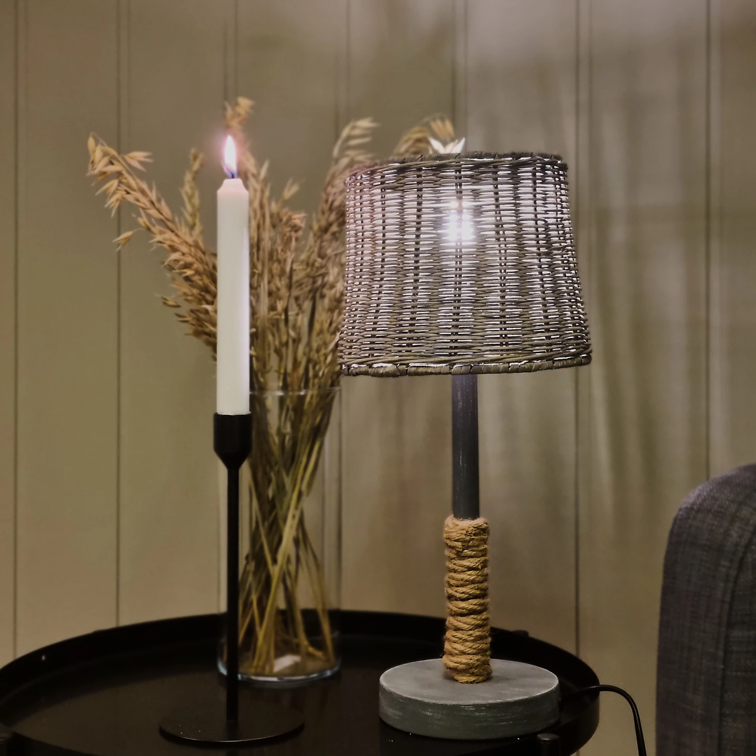 Bordlampen har en betong-lignende farge med en lampeskjerm i grå rotting.