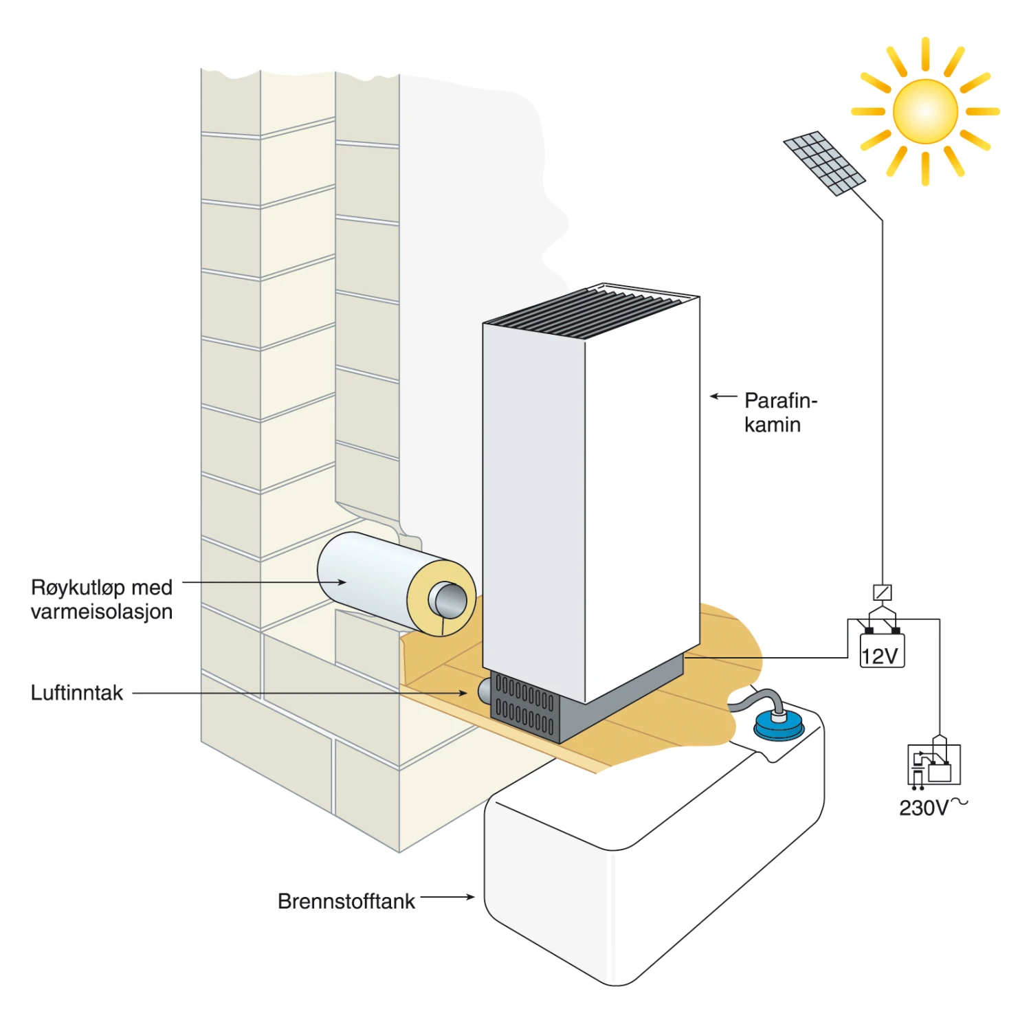 Wallas komplett kommer med: Wallas 26CC ovn, 175 liter tank, monteringssett for pipemontering, og fjernstarter. Veggjennomføring kommer i tillegg.