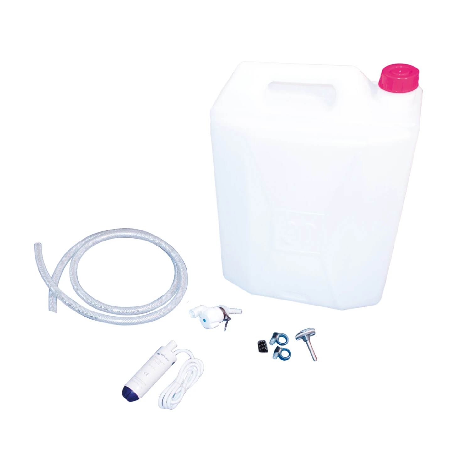 Inneholder: Dusjslange, nedsenkbar 12 volt pumpe, 12 volt bryter, 30 liters vannbeholder og nødvendig koblingsmateriell.