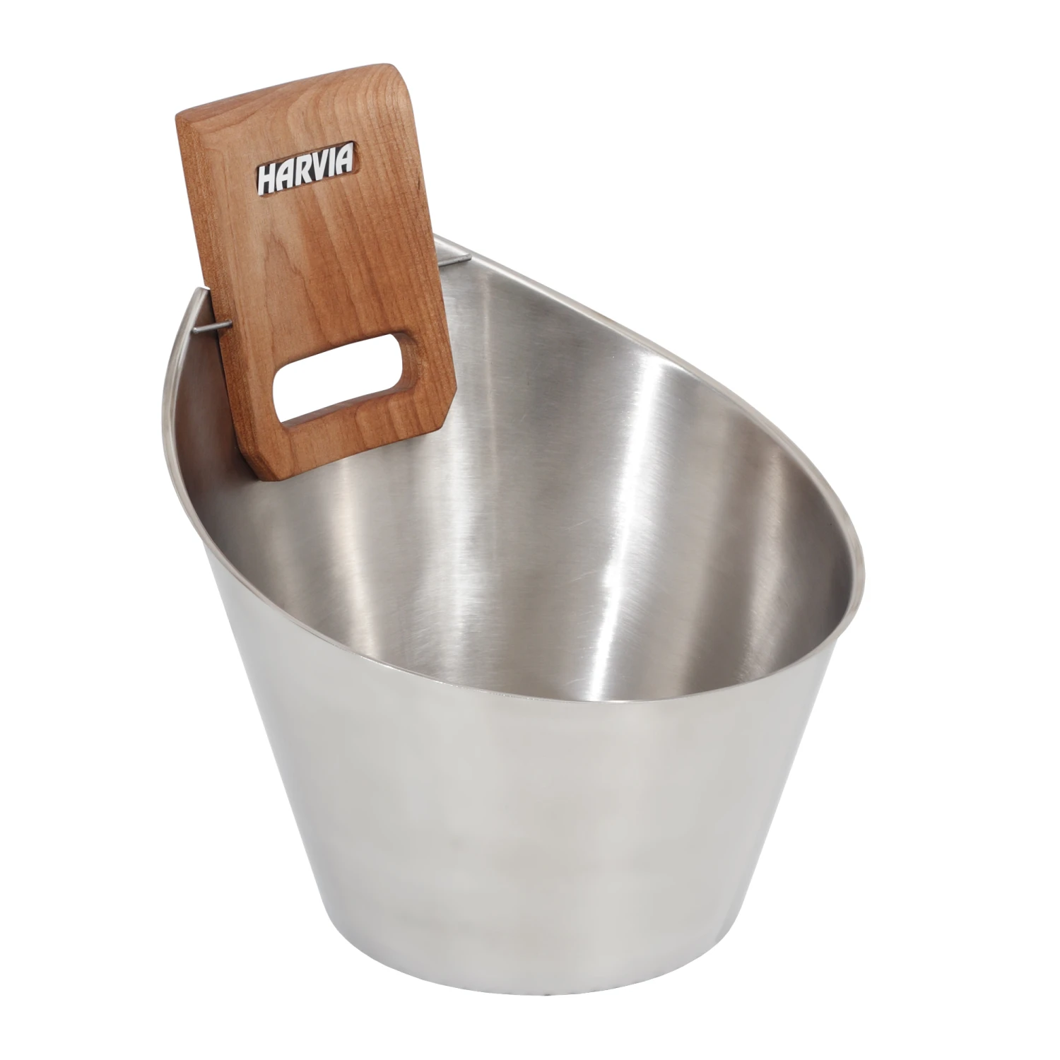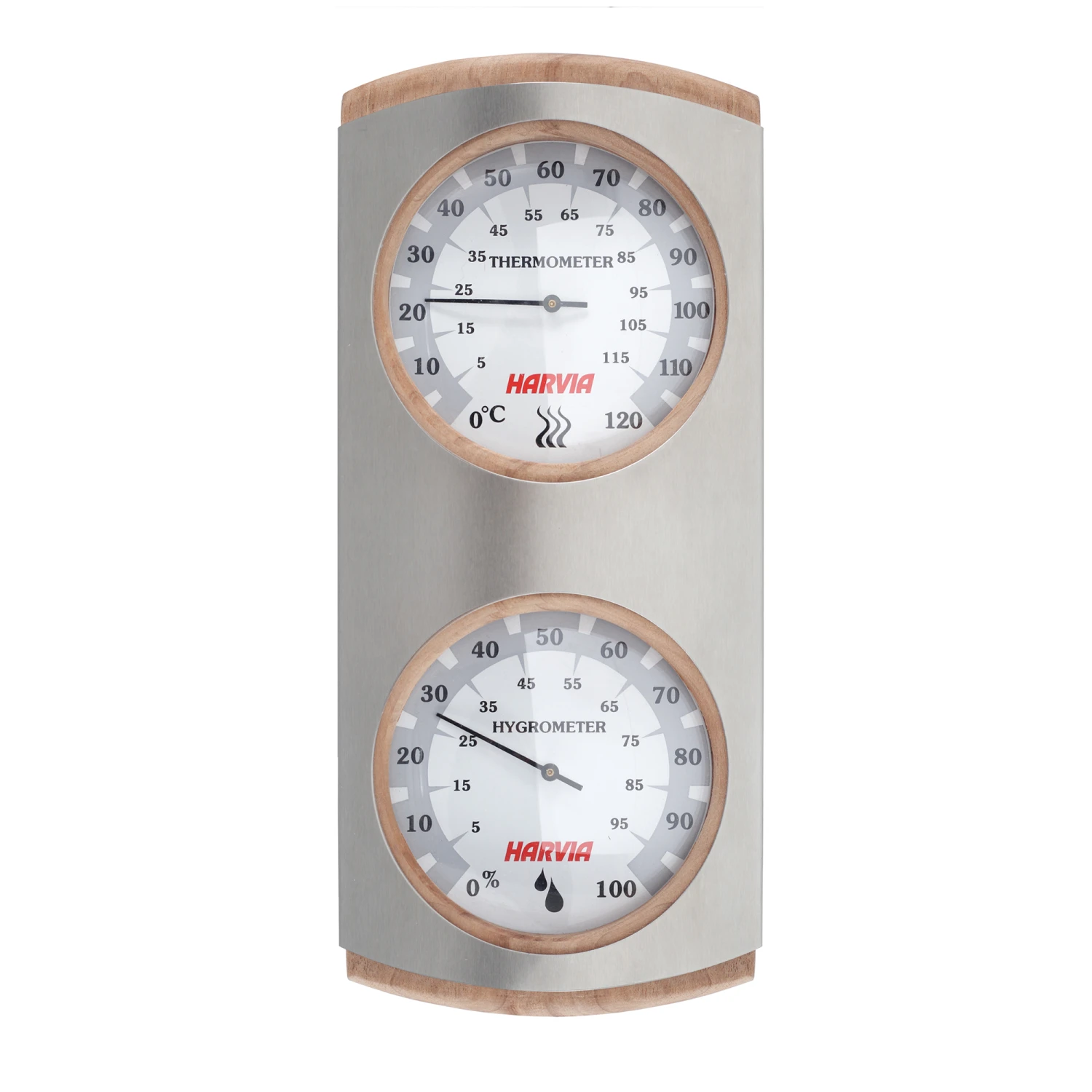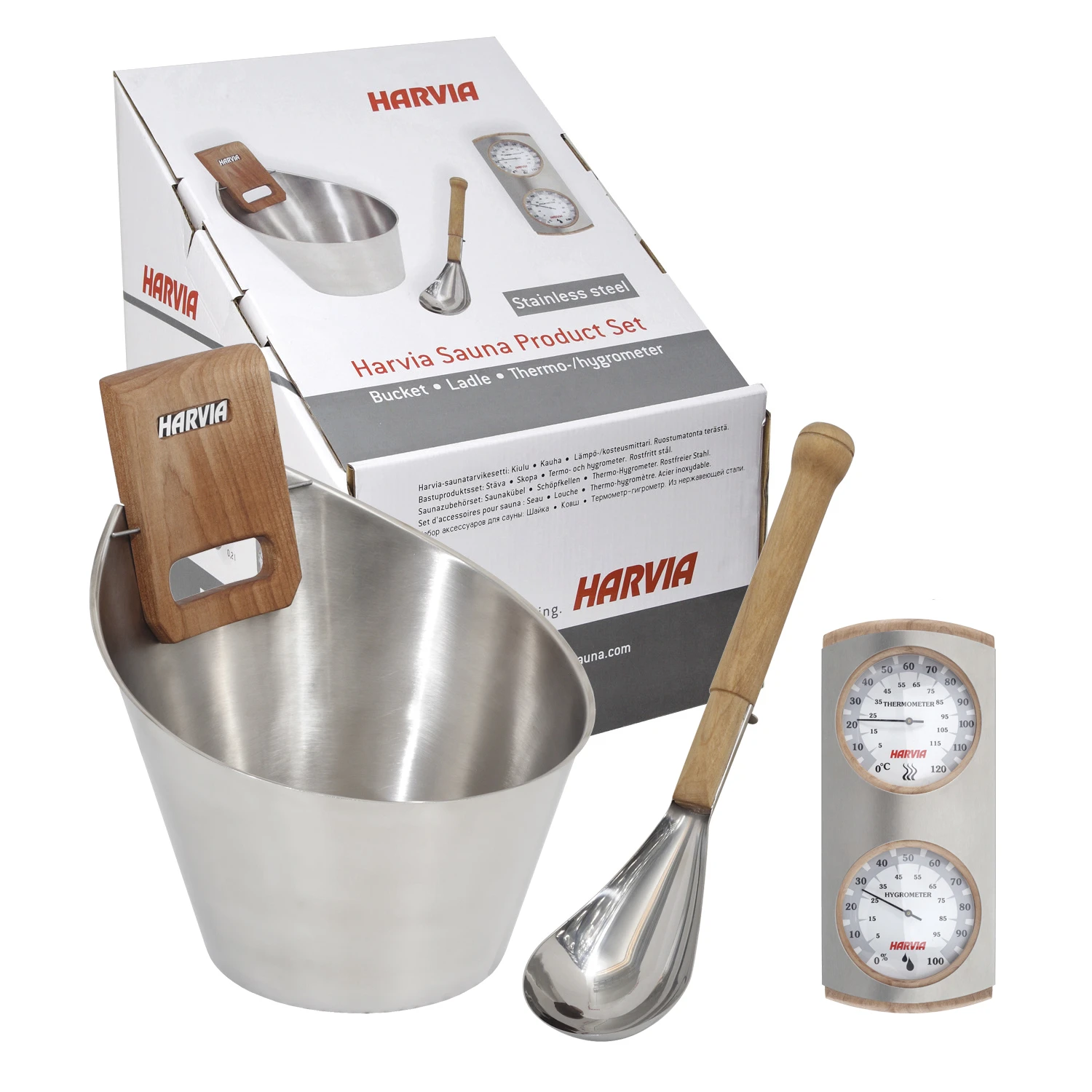 Gaveeske med badstuutstyr fra Harvia. Innhold: stamp i tre og rustfritt stål, sleiv og termo-/hygrometer.