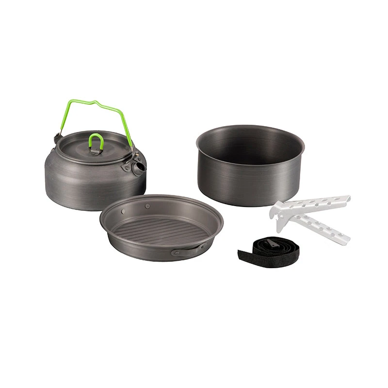 Grytesettet er produsert i hardanodisert aluminium med non-stick belegg. Gripehåndtaket er løst slik at du unngår å brenne deg over ilden. Alle deler pakkes ned i kjelen, og leveres med en stropp som holder settet sammen.