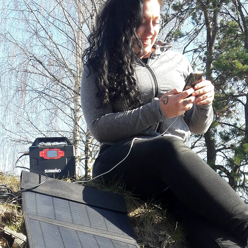 Litium Power Pack lades raskt opp med 230 volt hjemme, via sigarettuttak i bilen, eller med solcellepanel – vi anbefaler det sammenleggbare solcellepanelet Brett 30 watt for å kunne lade Litium Power Pack på tur.