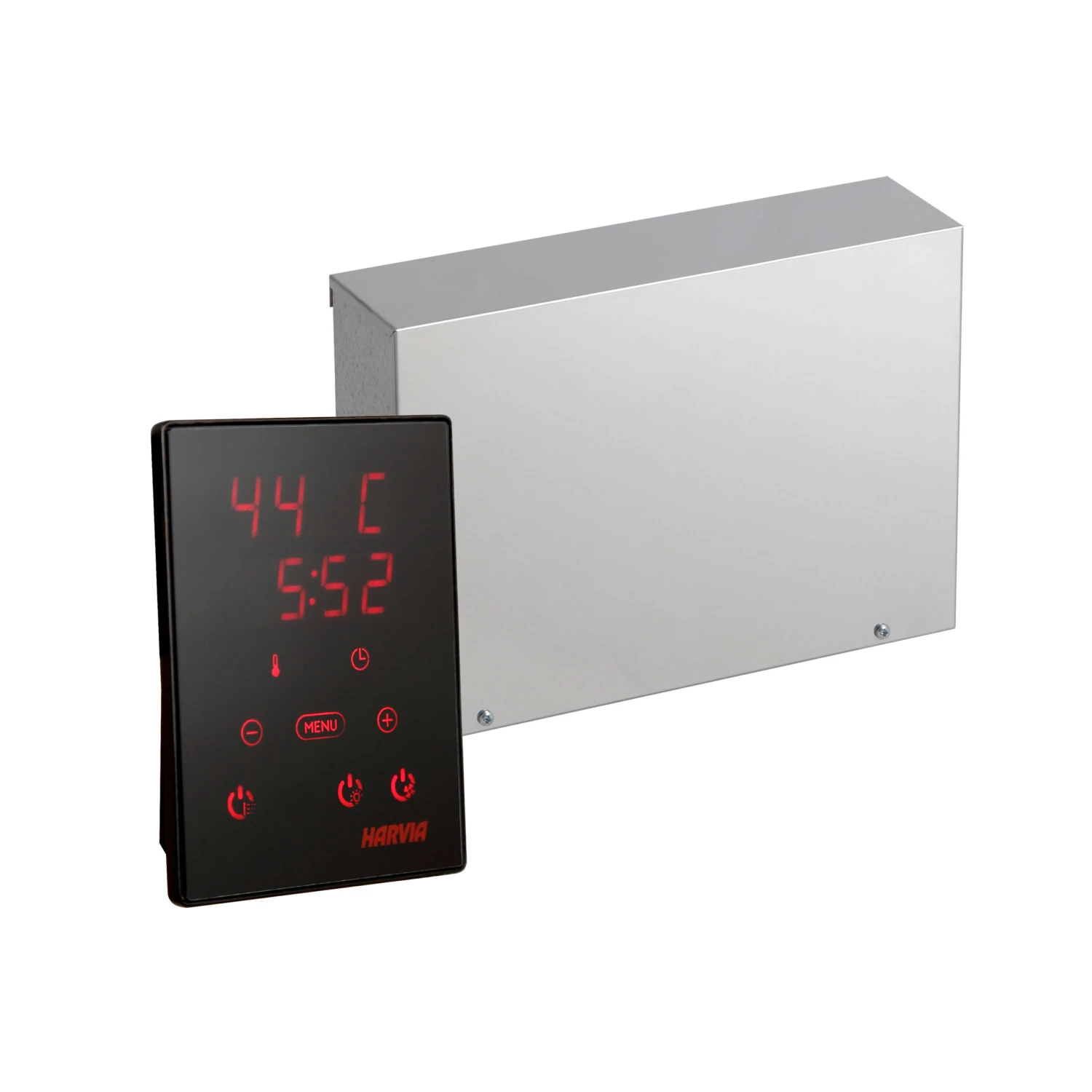 Harvia Xenio Infra er en kontrollenhet med et berøringskontrollpanel.